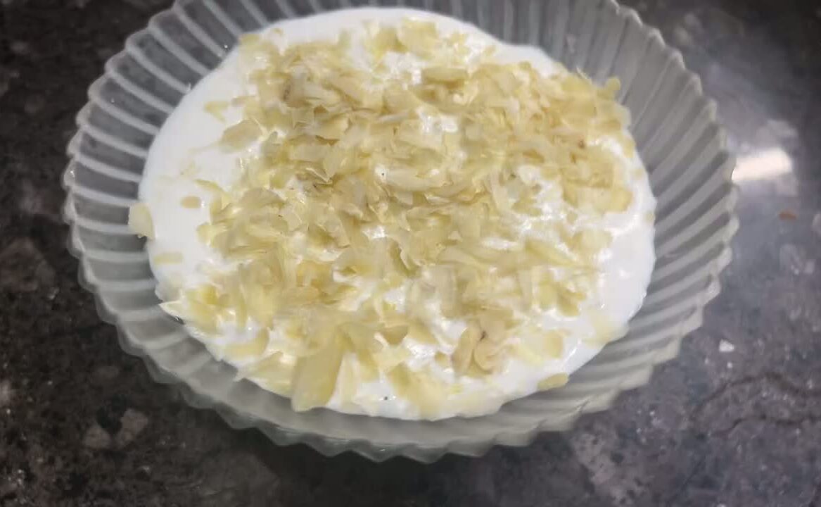 Top with the coconut cream we have made and garnish with sliced kaju.